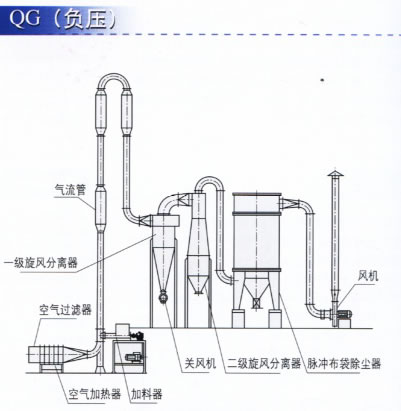 濕物料經(jīng)輸送機(jī)與加熱后的自然空氣同時進(jìn)入干燥器,二者充分混和,由于熱質(zhì)交換面積大,從而在很短的時間內(nèi)達(dá)到蒸發(fā)干燥的目的。干燥后的成品從旋風(fēng)分離器排出,一小部分飛粉由旋風(fēng)除塵器或布袋除塵器得到回收利用。Q型氣流干燥器是負(fù)壓操作,物料不經(jīng)過風(fēng)機(jī);QG型氣流干燥器是正壓操作;物料經(jīng)過風(fēng)機(jī)帶有粉碎作用;FG型氣流干燥器是尾氣循環(huán)型;JG型氣流干燥器是強(qiáng)化型氣流干燥器,其集閃蒸干燥 與氣流干燥為一體,是我廠根據(jù)用戶要求設(shè)計的新型干燥設(shè)備。