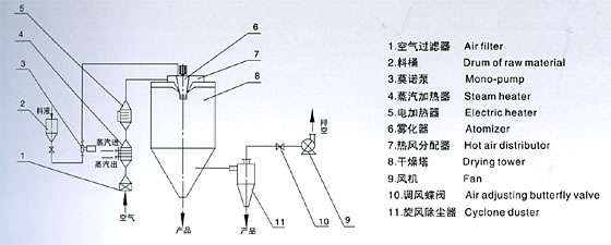 空氣通過過濾器和加熱器,進(jìn)入干燥器頂部的空氣分配器,熱空氣呈螺旋狀均勻進(jìn)入干燥器。料液由料液槽經(jīng)過濾器由泵送至干燥器頂部的離心霧化器,使料液噴成極小的物狀液滴,料液和熱空氣并流接觸,水份迅速蒸發(fā),在極短的時(shí)間內(nèi)干燥為成品。成品由干燥塔底部和旋風(fēng)分離器排出,廢氣由風(fēng)機(jī)抽出排出。